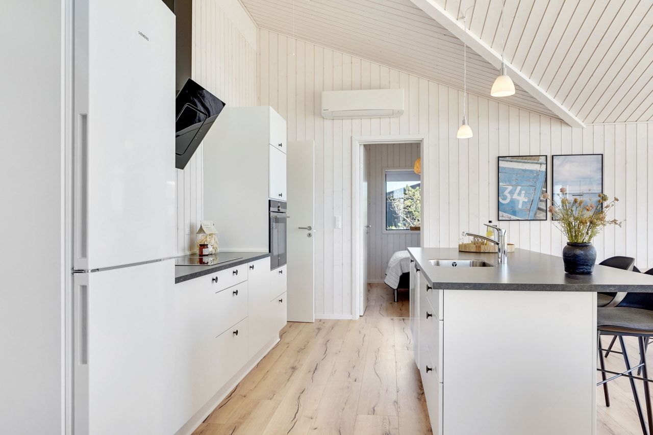 Indretning : Entré m/3 skabe, 3 gode værelser med hhv 1, 2 og 2 skabe, kombineret og rummelig opholds- og spisestue m/udgang til terrasse mod syd og vest og med åben forbindelse til køkkenet og hyggelig alkove og hems, der nok skal blive et hit hos børn og børnebørn, men også indbyder til en "morfar". Husets master-bedroom har 3 skabe, udgang til sydvendt terrasse og direkte adgang til det ene af husets 2 badeværelser med glas-brusekabine, indbygget vask, spejl og håndvask samt toilet, mens det andet badeværelse tillige har sauna og herudover er der forberedt til at køber nu eller senere kan installere en udendørs spa, idet der af sælger etableres bruser og trækkes rør hertil på terrassen. Begge badeværelser har gulvvarme, over hele huset er der panelradiatorer og der er desuden Panasonic luft-luft varmepumpe centralt placeret i stuen.