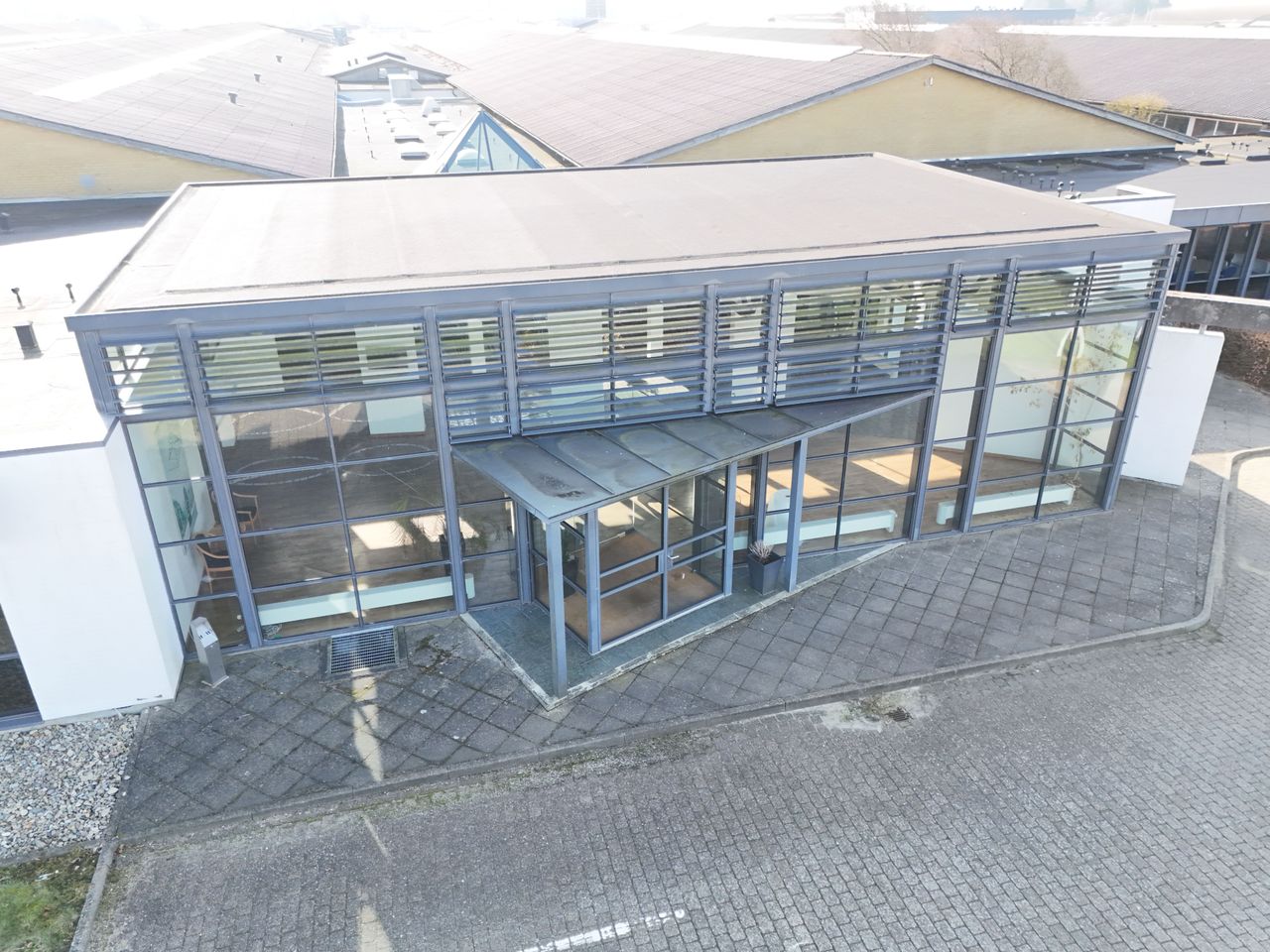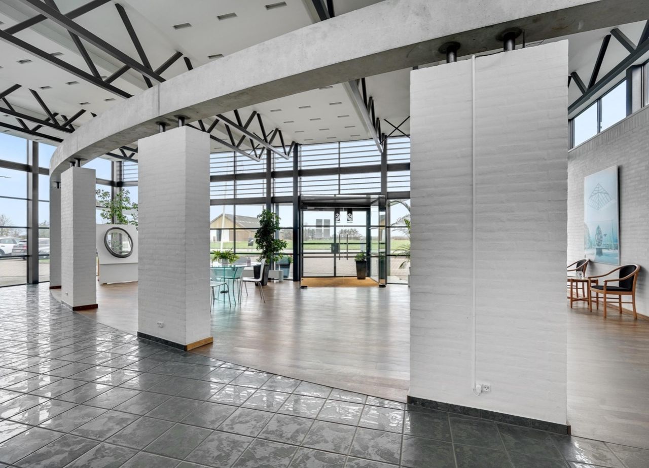 Det markante indgangsparti, der giver adgang til kontorer, mødefaciliteter og kantine til 120 personer er tegnet af det anerkendte arkitektfirma Bay Jørgensen.