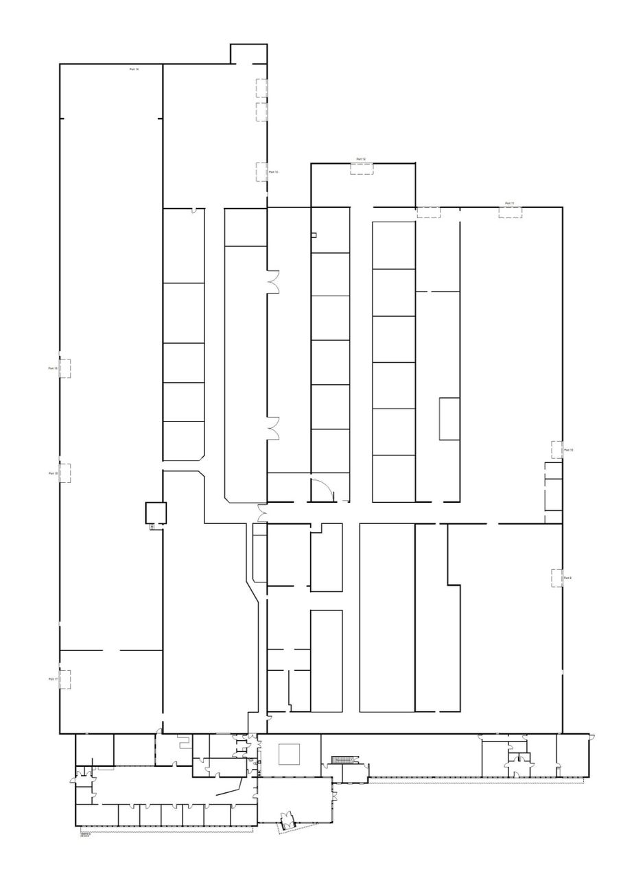 Består af i alt 8 indbyrdes forbundne bygninger på hhv 73 m2, 302 m2, 324 m2, 1.280 m2 +180 m2 kælder (administration og kantine), 2.195 m2, 2.332 m2. 2.691 m2 og 2.797 m2.