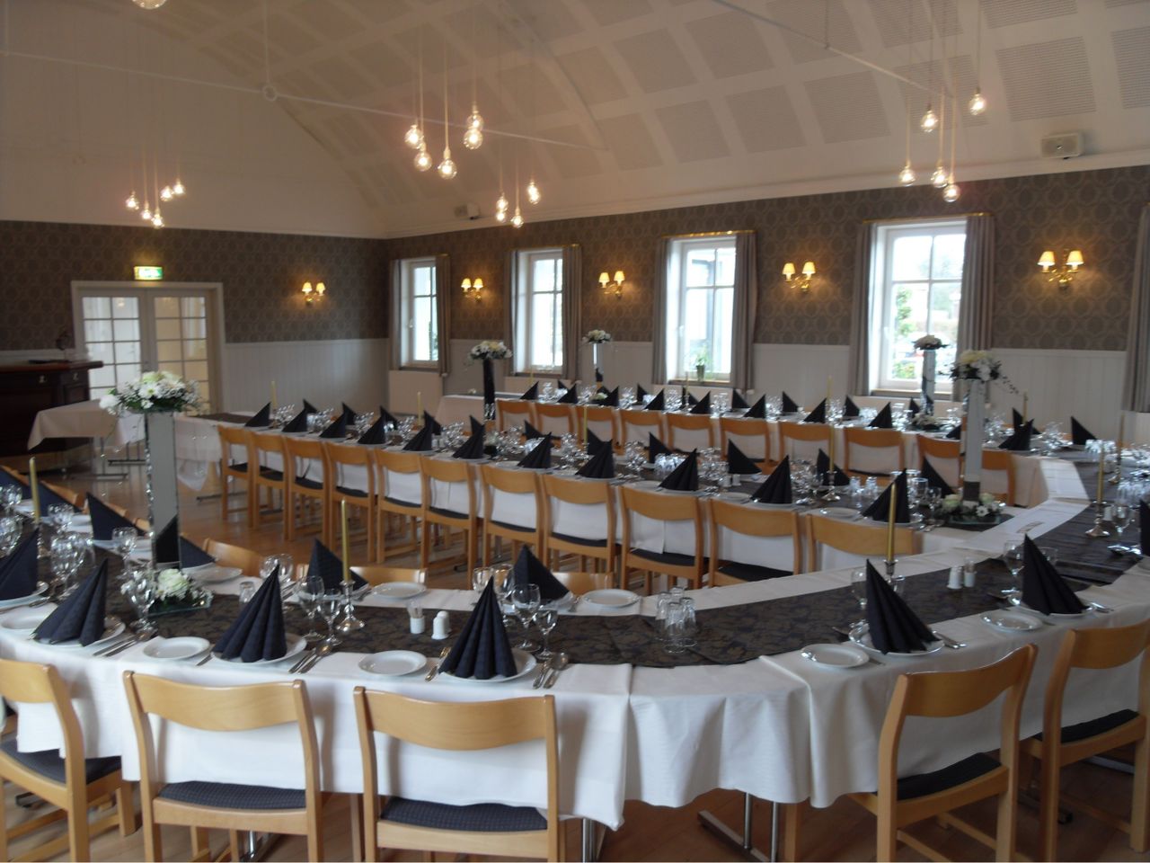 paneler i ca 1,20 m`s højde, parketgulve og med plads til op til ca 150 persone (de 2 sale kan opdeles til